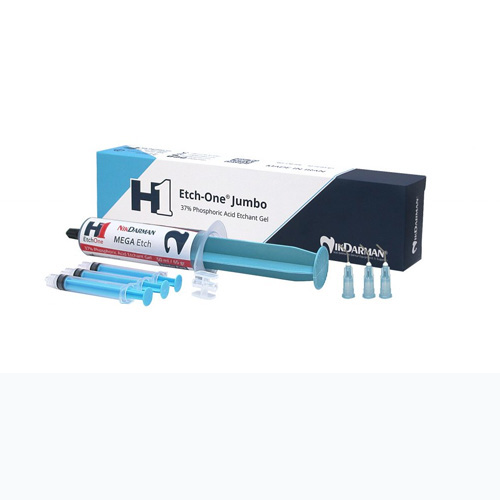 ژل اسید اچ جامبو H1 Mega Etch ، حاوی اسید فسفریک 37%، با فرمولی بهبود یافته، برای اچ کردن سطح مینا و عاج و افزایش چسبندگی پرایمر، سمان ها، باندینگ و انواع رستوریشن ها طراحی شده. قوام مناسب و رنگ اختصاصی H1، موجب سهولت هندلینگ، شستشوی آسان و تشخیص بهتر محصول می شود.