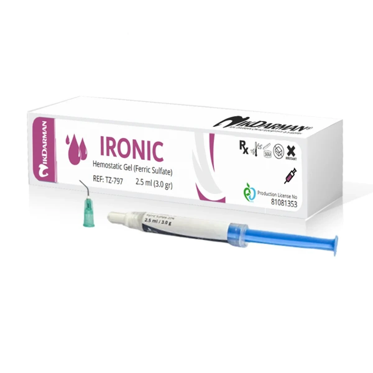 ژل انعقاد خون آیرونیک IRONIC Gel (خونبند) حاوی 20 درصد فریک سولفات در یک بستر ویسکوز بی اثر و محلول در آب است.PH این محصول با فرمولاسیون انحصاری شرکت نیک درمان، در حدود 1,0 بوده، لذا محصول حاوی معرف هایی ویژه به منظور تلطیف عملکرد و محافظت از بافت های سخت و نرم دهان می باشد.